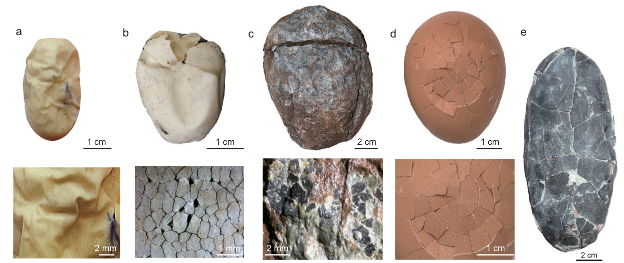 革質蛋則介於(yu) 二者之間,雖然蛋殼的鈣質層仍然較薄(70-200 μm)並且蛋殼具有一定韌性,但是蛋殼碎片邊緣較為(wei) 銳利,還具有特定形態的殼單元(方解石或文石)。現生動物中海龜、擬鱷龜和部分蜥蜴蛋屬於(yu) 這種類型。