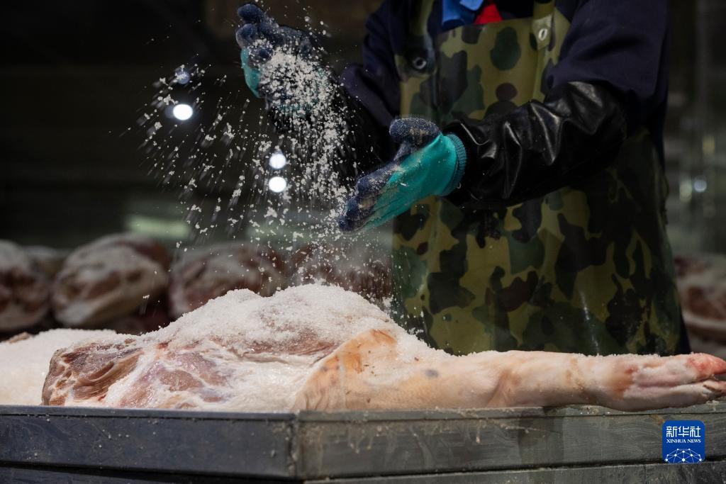 首先,挑選最好的生豬,屠宰後取後腿,精心整修,刮去腿麵殘毛汙物,修成琵琶形,使其平整。接著醃製,將食鹽均勻擦在腿上,慢慢溶入肉中。整個(ge) 過程約需一個(ge) 月,一般擦鹽6—8次。這是加工火腿的主要工藝環節,決(jue) 定著火腿質量。然後,將其一層層整齊地堆疊在“腿床”上,20多天後即可取出用清水洗淨,選晴朗天氣掛曬。接下來就是整形,使其腿幹挺直,腳尖呈鉤狀,再掛於(yu) 通風幹燥、陰涼的地方發酵。在酶的作用下,使火腿肉中的蛋白質和脂肪等各種成分發生一係列變化後產(chan) 生濃鬱香氣,形成火腿風味,最後落架分級。總之,一根火腿要經過冬季醃製晾曬、春夏發酵、秋天風幹,曆時10個(ge) 月以上才能上市。