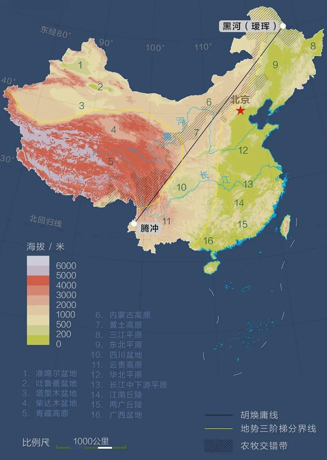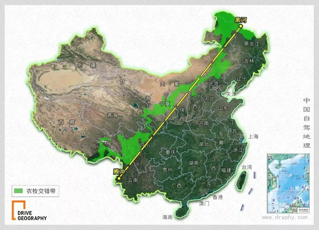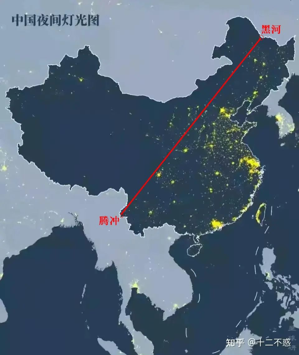 這條線北起黑龍江璦琿(今黑河市),南至雲(yun) 南騰衝(chong) ,是一條大致呈東(dong) 北-西展布的斜線,因而又叫“璦琿—騰衝(chong) 線”,後因地名變遷又稱“黑河—騰衝(chong) 線”。