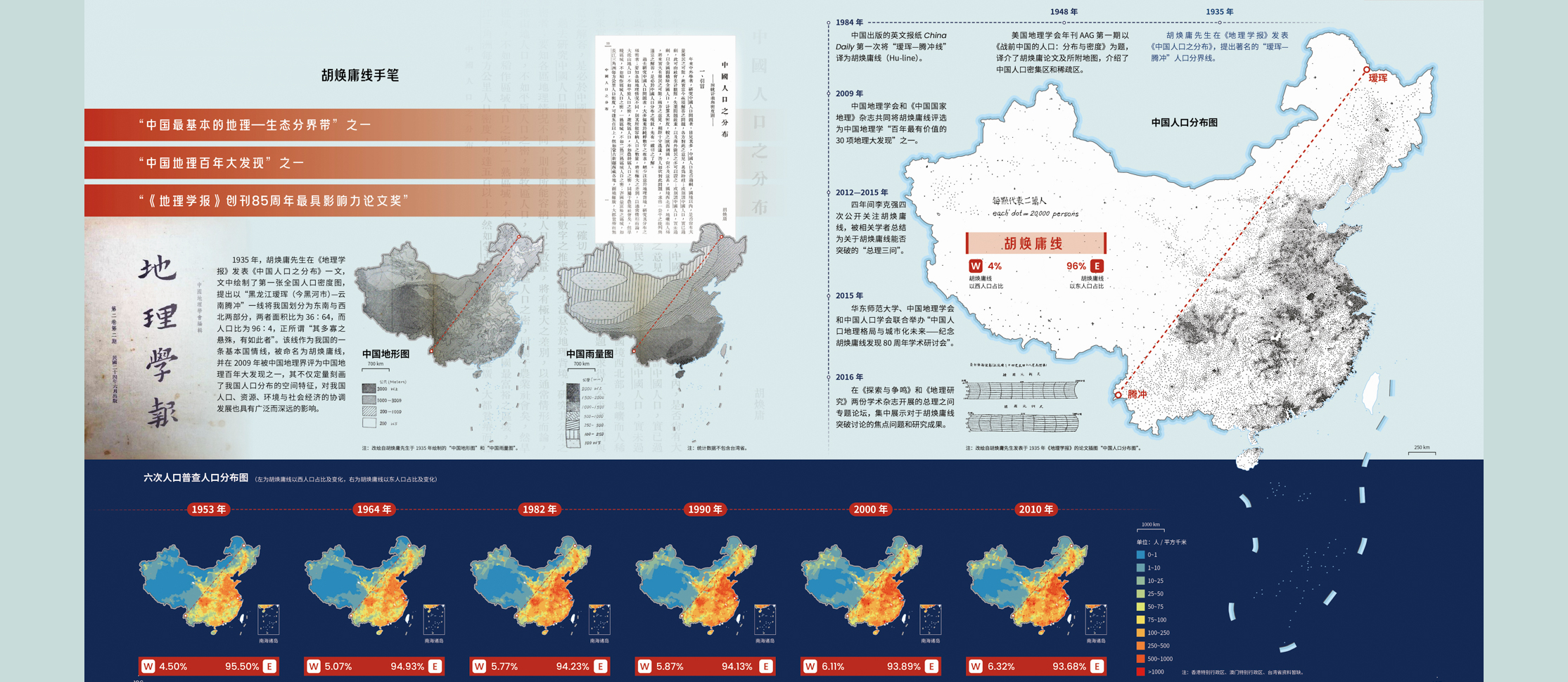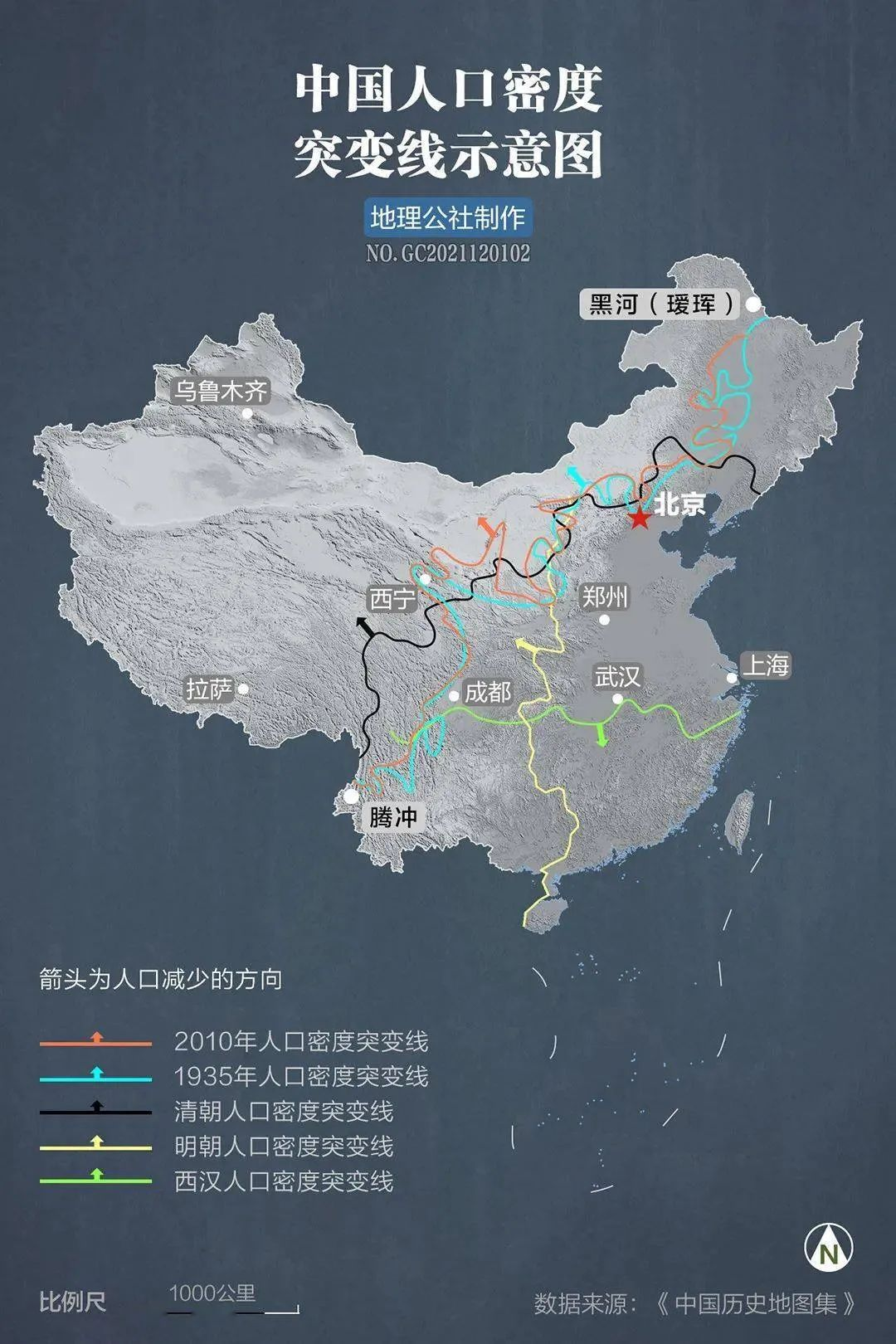 而這期間,不僅(jin) 經曆了疆域變遷、新中國成立、改革開放等曆史性變革,發生過建設兵團墾荒戍邊、支援大西北、三線建設、西部大開發等重大事件,但是這條分界線依然穩如磐石,它所揭示的人口分布規律從(cong) 未被打破。