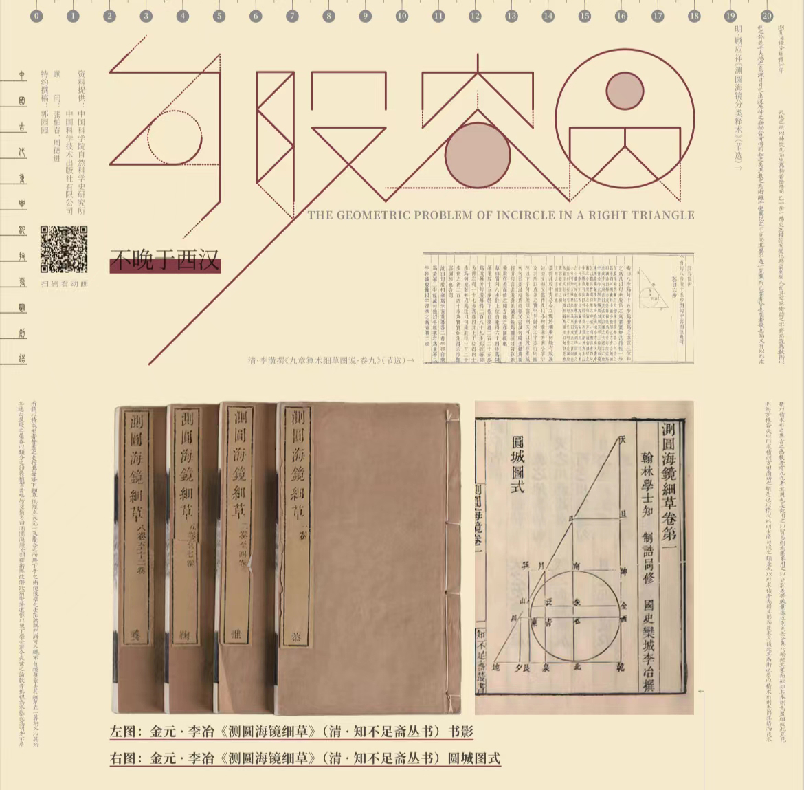 這是全書(shu) 的總括圖解,由一個(ge) 直角三角形、它的內(nei) 切圓以及一些特定的點和直線組成。其中的頂點、圓心和交點都用某個(ge) 漢字來指代,相當於(yu) 西方用字母,有異曲同工之妙,是為(wei) 李冶的創造。