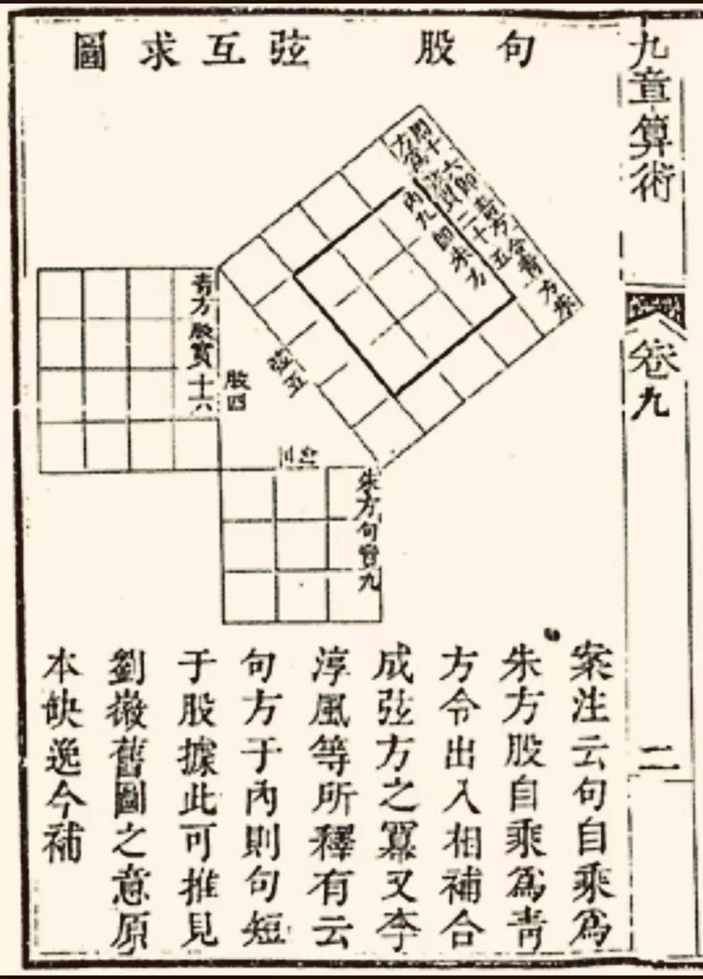 宋金時期,洞淵在此基礎上研究了同一個(ge) 圓和各種勾股形的相切關(guan) 係,給出了由勾股形的三邊求圓徑的9個(ge) 公式,稱為(wei) “洞淵九容”。洞淵是道教的派別,通“九數”,活躍於(yu) 唐宋。