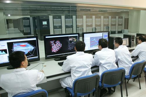 正在對“天河一號”超級計算機進行係統性能測試的科研人員(來源:新華社)