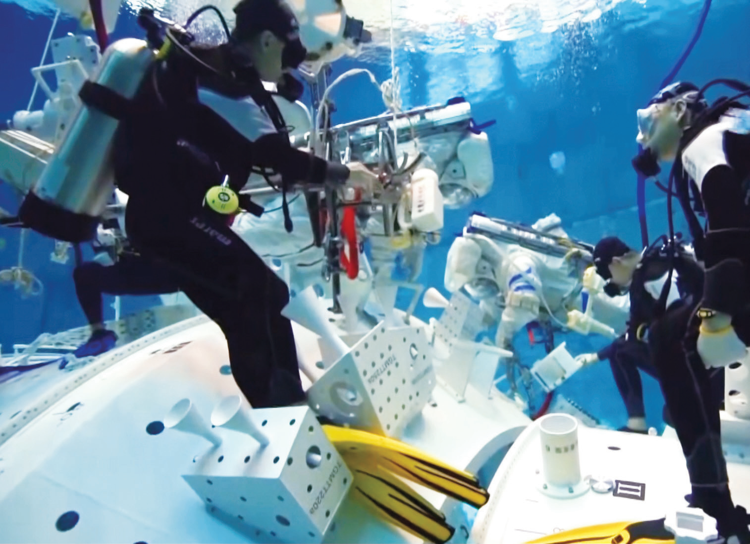 這方麵訓練大部分是在模擬失重水槽裏進行。模擬失重水槽由槽體(ti) 、水處理係統、人體(ti) 生理參數監測係統、高壓氣源係統以及救生與(yu) 醫療救護設備等組成,水質要達到飲用水標準,水深10~15米,有一個(ge) 與(yu) 實物大小相同的空間站氣閘艙。