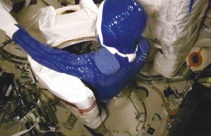 出艙活動時,兩(liang) 位航天員首先穿著艙外服,進行艙外服的係統檢查和艙外服艙載對接係統檢查,“鑽”進服裝,對服裝進行尺寸調整、氣密性檢查和全性能測試,確保一切正常。“穿衣”的過程中,兩(liang) 名航天員互相配合,一人操作,另一人讀操作手冊(ce) 確認,確保所有步驟萬(wan) 無一失。