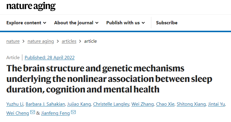 上海複旦大學馮(feng) 建峰教授和英國劍橋大學的研究人員在" Nature Aging "期刊上發表了一篇題為(wei) " The brain structure and genetic mechanisms underlying the nonlinear association between sleep duration,cognition and mental health "的研究論文。