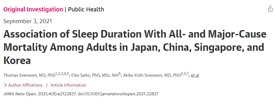 多國研究人員聯合在" JAMA Network Open "期刊發表了一篇題為(wei) " Association of Sleep Duration With All-and Major-Cause Mortality Among Adults in Japan,China,Singapore,and Korea "的研究論文。