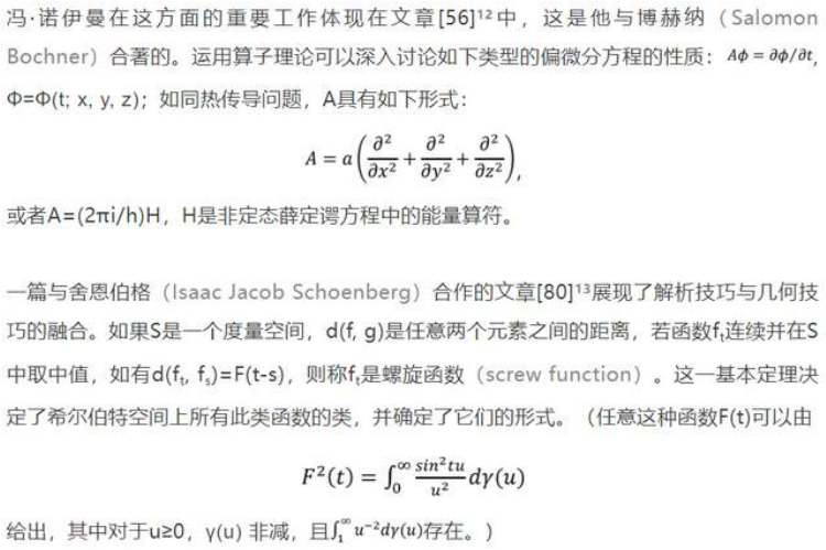 在量子力學史上,至少有兩(liang) 項數學貢獻是重要的:狄拉克的數學處理並不總是滿足數學嚴(yan) 謹性的要求。例如,它假設每個(ge) 自伴隨算符都可以被對角化,這迫使人們(men) 為(wei) 那些無法做到這一點的算符引入狄拉克著名的“反常”函數。正如馮(feng) ·諾伊曼所說,先驗地看來,就像牛頓力學(當時)需要矛盾的無窮小演算一樣,量子理論似乎需要一種對無限多個(ge) 變量進行分析的新形式。馮(feng) ·諾伊曼所取得的成果表明事實並非如此。也就是說,變換理論(Transformation theory)可以建立在一個(ge) 明確的數學基礎上,不是細扣狄拉克的方法,而是通過發展希爾伯特的算子譜理論。特別是,這是通過他對無界算子的研究來實現的,超越了希爾伯特、裏斯(Frigyes Riesz)和施密特等人的經典理論。