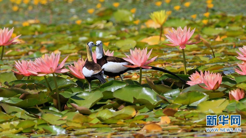 水雉是鴴形目水雉科的一種中小型鳥類,又名長尾水稚。大多生活在富有挺水植物和漂浮植物的淡水湖泊、池塘、沼澤地帶,主要以昆蟲、蝦等小型無脊椎動物和水生植物為(wei) 食。因其腳爪細長,能輕步行走於(yu) 睡蓮、荷花、菱角、芡實等浮葉植物上,且體(ti) 態優(you) 美,羽色豔麗(li) ,被美稱為(wei) “淩波仙子”。