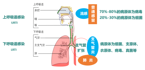 很多人認為(wei) 呼吸道感染就是我們(men) 常說的感冒,其實這種觀點並不正確。呼吸道感染是包括鼻、咽、喉、氣管、支氣管及肺部的感染性炎症,以喉為(wei) 界,分為(wei) 上呼吸道感染及下呼吸道感染。主要表現為(wei) 發熱、咳嗽、咳痰、呼吸困難等,而感冒是呼吸道感染最常見的一種。
