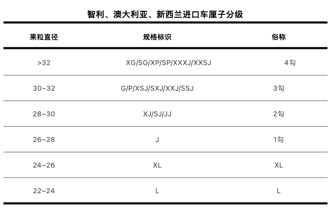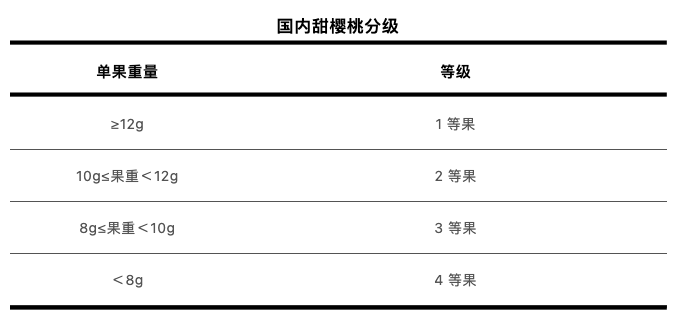 雖然劃分等級不能完全等同於(yu) 車厘子是否好吃,但果實大小往往都與(yu) 車厘子發育成正比,所以按照大小進行選擇往往是簡單有效的方式。而我國甜櫻桃分級與(yu) 進口車厘子不同,我國多以果實單果重量作為(wei) 分級標準。