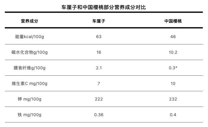 注:車厘子營養(yang) 數據來源於(yu) 美國農(nong) 業(ye) 部營養(yang) 數據庫,中國櫻桃營養(yang) 數據來源於(yu) 《中國食物成分表》;*中國櫻桃的膳食纖維為(wei) 不溶性膳食纖維。
