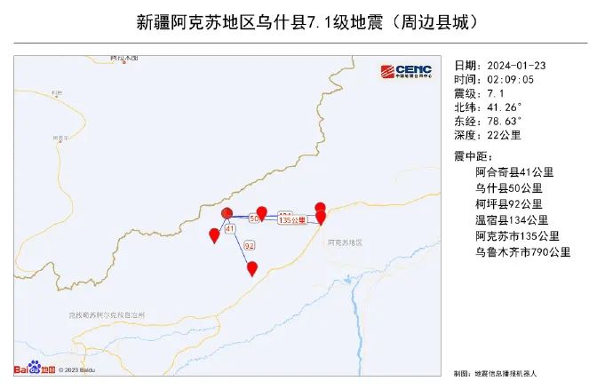中國地震台網正式測定:1月23日2時09分,在新疆阿克蘇地區烏(wu) 什縣(北緯41.26度,東(dong) 經78.63度)發生7.1級地震,震源深度22公裏。