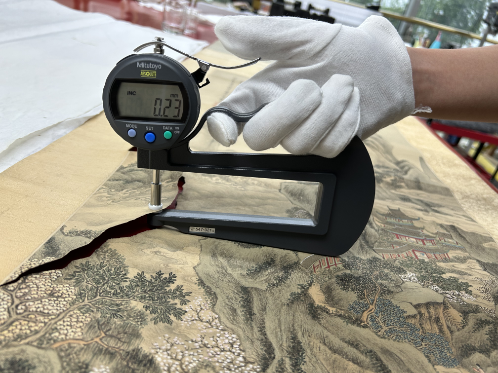 修複前,對《趙垓山水圖軸》測試厚度。(受訪者供圖)