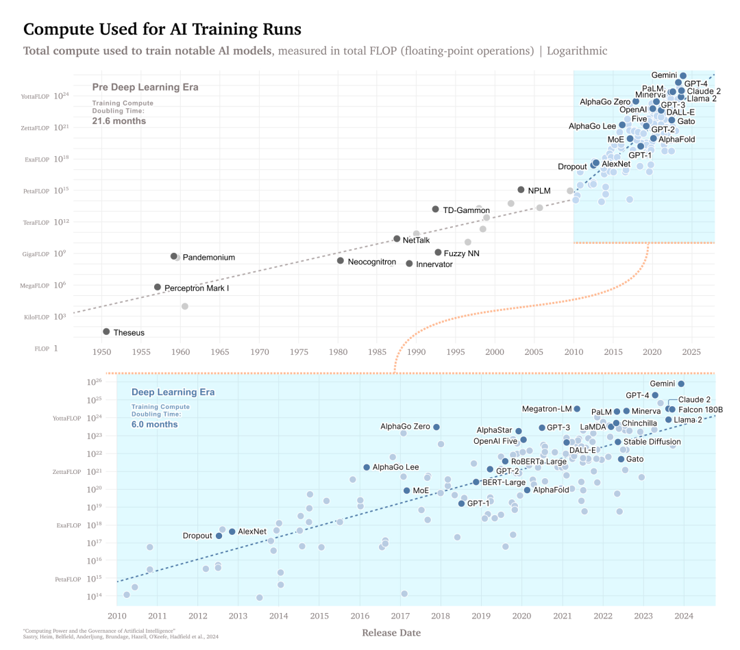 圖|自 2010 年以來,用於(yu) 訓練 AI 模型的計算量大約每六個(ge) 月翻一番,數據來自 Epoch。
