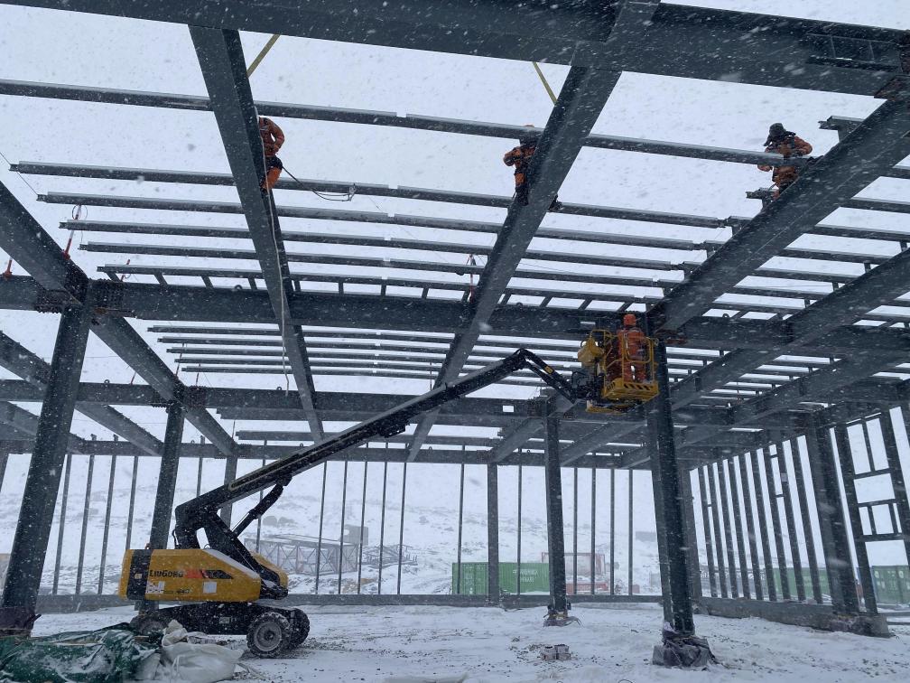 2024年1月16日,中國第40次南極考察隊員在安裝後勤中心檁條。新華社發(胡晴攝)