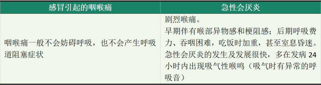 急性會(hui) 厭炎起病突然、發展迅速,易造成上呼吸道阻塞,但發病前期和扁桃體(ti) 炎、咽喉炎疼痛沒有太大區別,並且會(hui) 厭的生理位置比扁桃體(ti) 位置低,因此常被忽視。二者比較見表1。