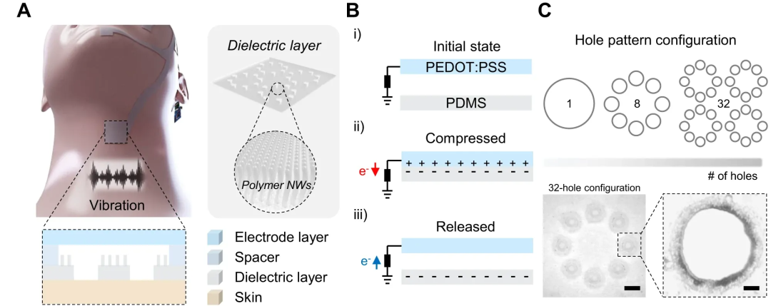 圖|振動傳(chuan) 感單元的工作機製和表征。A. 振動傳(chuan) 感單元的示意圖。插圖:檢測聲帶振動的傳(chuan) 感單元的放大視圖。B. 工作循環期間傳(chuan) 感單元的電勢分布。C. 用於(yu) 聲音振動傳(chuan) 感器的孔圖案配置示意圖以及 32 孔配置中孔的 SEM 圖像。比例尺:2 mm(插圖:顯示聲孔的放大視圖。比例尺:400 μm)。