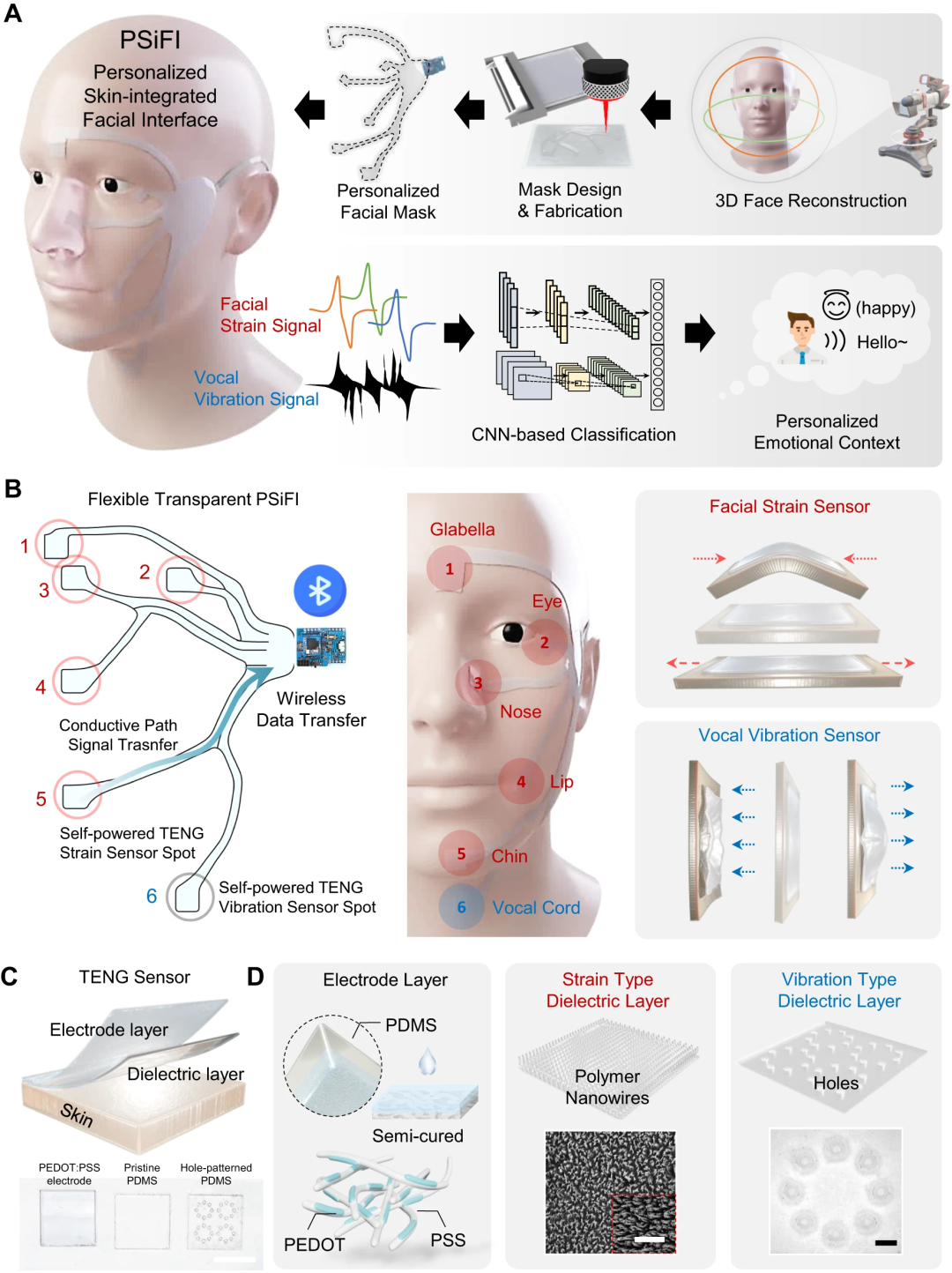 據介紹,該係統的核心是個(ge) 性化皮膚集成麵部界麵(Self-powered Skin-interfaced Facial and Vocal Emotion Recognition Interface,PSiFI)係統,該技術基於(yu) 自供電的摩擦電原理,通過特製的傳(chuan) 感器單元,能夠同時感知麵部和聲音表達所產(chan) 生的信號,從(cong) 而實現對人類情感的準確識別。