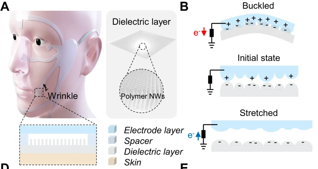 圖|應變傳(chuan) 感單元的工作機理及表征。A. 應變傳(chuan) 感單元的示意圖。插圖:檢測麵部應變的傳(chuan) 感單元的放大視圖。B. 應變傳(chuan) 感單元在屈曲和拉伸狀態下的電位分布。