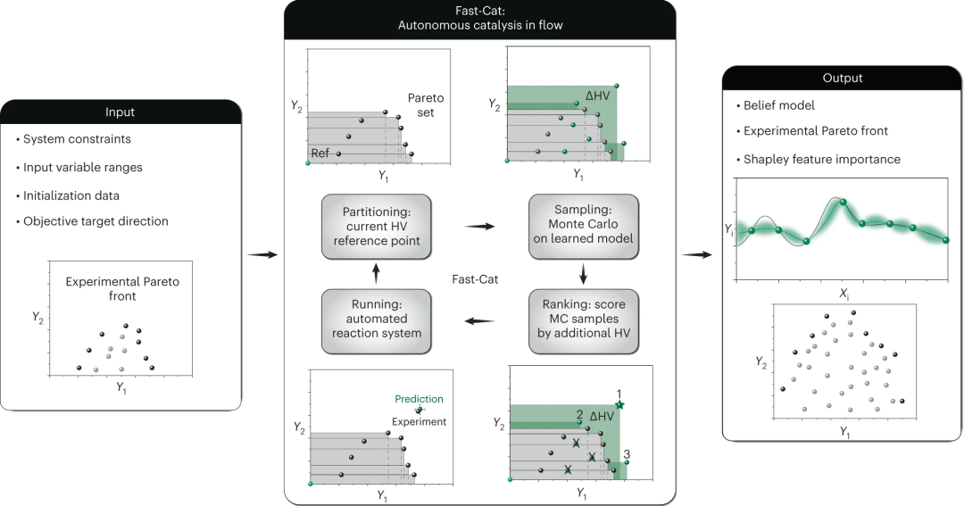 圖|Fast-Cat 工作流程概述。輸入:先前數據、約束條件和優(you) 化目標。循環:確定當前超體(ti) 積(HV),蒙特卡洛(MC)在新點對 ML 模型進行采樣,根據預測獲得的超體(ti) 積對點進行排名(點 1 處的綠色星表示 HV 改進最大的預測,然後是點 2 和3 按順序),對最佳預測進行實驗並重複。輸出:最新的替代模型(曲麵圖和特征分析)和實驗數據點(帕累托前沿)。