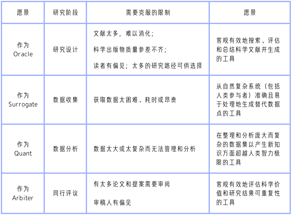 表|科學研究中的 AI 願景。通過分析最近有關(guan) AI 改善跨科學學科星空体育官网入口网站生產(chan) 潛力的出版物,得出以上四種類型。納入的論文要麽(me) 使用“AI”這個(ge) 通用短語,要麽(me) 提到 AI 概念之下的特定方法,最常見的是機器學習(xi) 、自然語言處理和大型語言模型。該表總結了願景如何響應不同的研究階段,以及對科學能力和效率的感知限製。