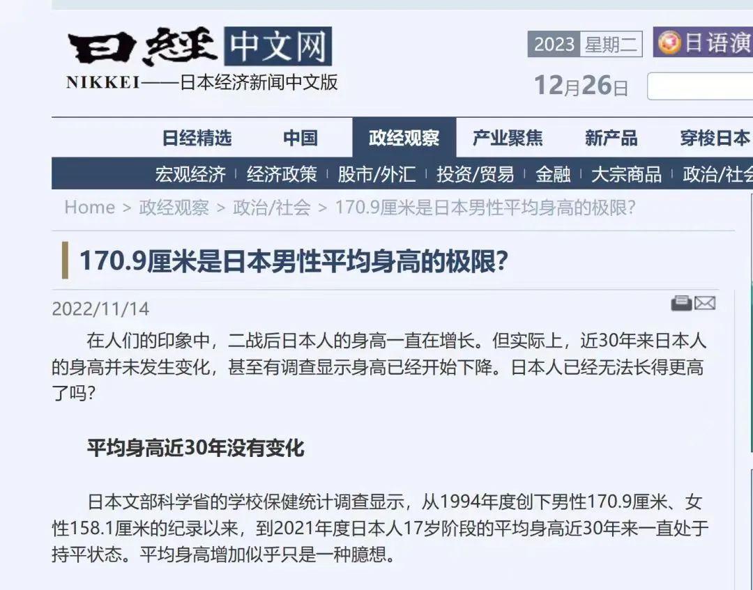 該文章也發出疑問:“日本人已經無法長得更高了嗎?”