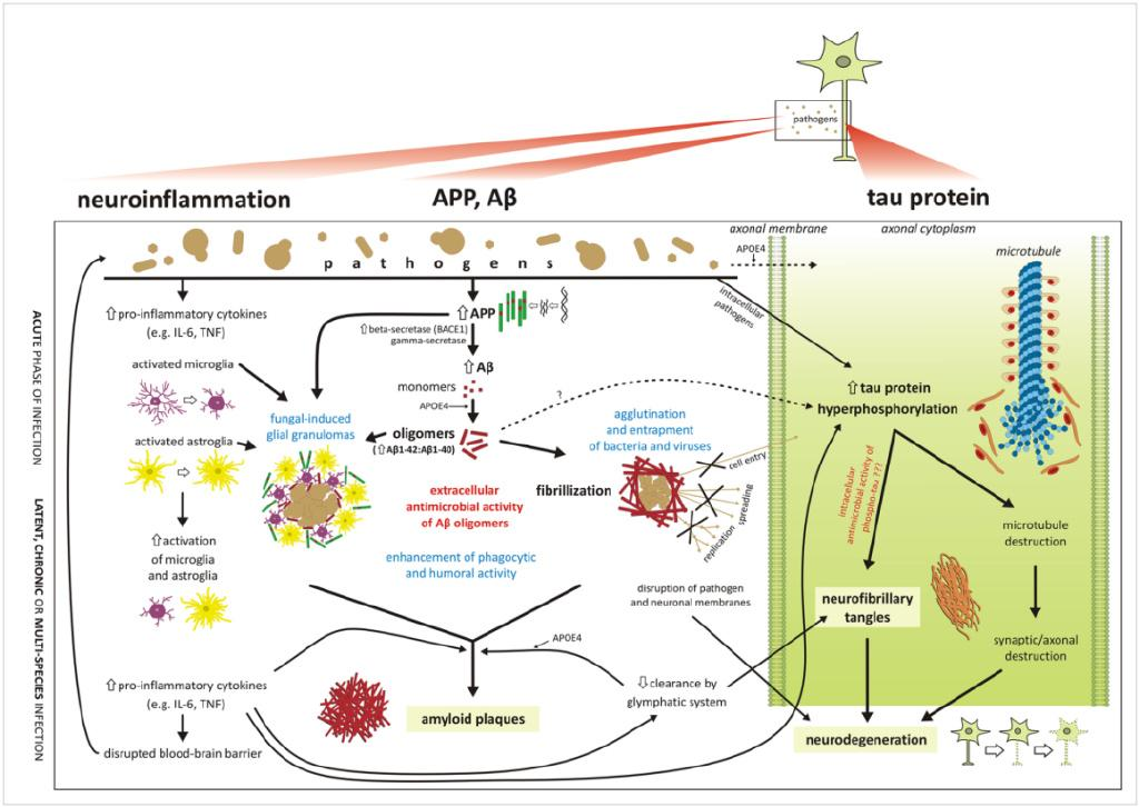圖1:圖片展示了病原體(ti) 感染中樞神經係統後,激活免疫反應,其中β-澱粉樣蛋白累積便是消除病原體(ti) 的手段之一,但隨後也會(hui) 形成澱粉樣蛋白沉積斑塊。來源:
