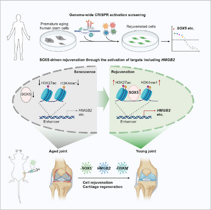 2023年10月12日,中國科學院動物研究所劉光慧研究組、曲靜研究組,聯合中國科學院北京基因組研究所張維綺課題組、任捷課題組,在《細胞-幹細胞》(Cell Stem Cell)上,在線發表了題為(wei) Genome-wide CRISPR activation screening in senescent cells reveals SOX5 as a driver and therapeutic target of rejuvenation的研究論文。在論文中,作者報道了新發現的SOX5基因,可以讓細胞在不改變細胞身份(攜帶自身“記憶”)的前提下發生細胞更生,讓已衰老的細胞重新年輕活化。