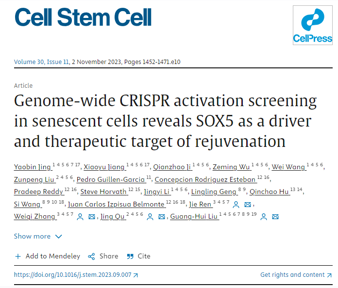 [1] Yaobin Jing, Xiaoyu Jiang, Qianzhao Ji, Zeming Wu, Wei Wang, Zunpeng Liu, Pedro Guillen-Garcia, Concepcion Rodriguez Esteban, Pradeep Reddy, Steve Horvath, Jingyi Li, Lingling Geng, Qinchao Hu, Si Wang, Juan Carlos Izpisua Belmonte, Jie Ren, Weiqi Zhang, Jing Qu, Guang-Hui Liu,Genome-wide CRISPR activation screening in senescent cells reveals SOX5 as a driver and therapeutic target of rejuvenation,Cell Stem Cell,Volume 30, Issue 11,2023,Pages 1452-1471.e10,ISSN 1934-5909,https://doi.org/10.1016/j.stem.2023.09.007.