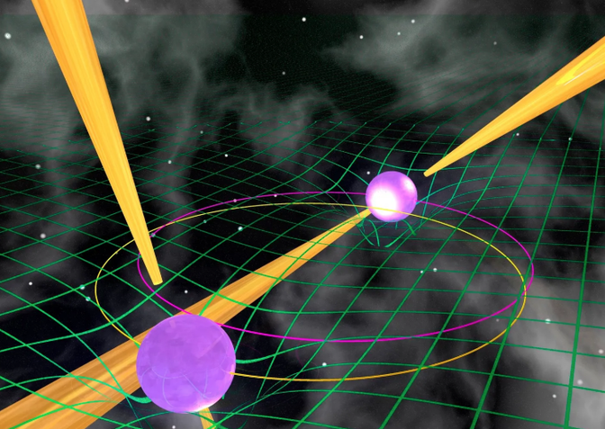 在地球上,我們(men) 已經開發出非常靈敏的引力波探測器,能夠感知短暫但響亮的事件,比如黑洞合並,這種事件隻持續幾秒鍾,但會(hui) 產(chan) 生如此巨大的信號,我們(men) 得以探測到。 (“巨大”在這裏是一個(ge) 相對的詞;由通過的波引起的畸變小於(yu) 原子核的寬度。)