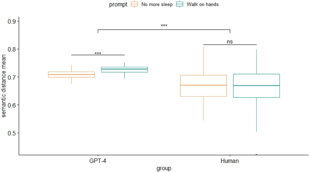 最後,研究團隊還強調了人類創造力的獨特性和多樣性。與(yu) ChatGPT-4 相比,人類具有更廣泛的經驗和情感體(ti) 驗,能夠以更靈活和多樣的方式思考和創造。因此,在探討創造性潛力時,不能簡單地將 ChatGPT-4 的表現與(yu) 人類相提並論,同時也需要更全麵地考慮其在實際應用中的適用性和局限性。