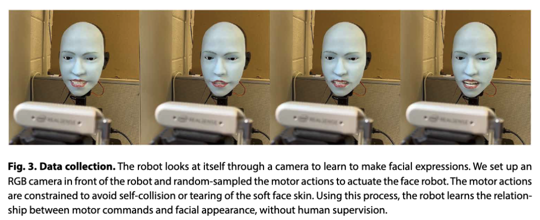 為(wei) 了訓練 Emo 學會(hui) 做出麵部表情,研究團隊把 Emo 放在攝像頭前,讓它做隨機動作。幾個(ge) 小時後,Emo 就學會(hui) 了麵部表情與(yu) 運動指令之間的關(guan) 係——就像人類通過照鏡子練習(xi) 麵部表情一樣。他們(men) 將其稱為(wei) “自我建模”——類似於(yu) 人類想象自己做出特定表情時的樣子。