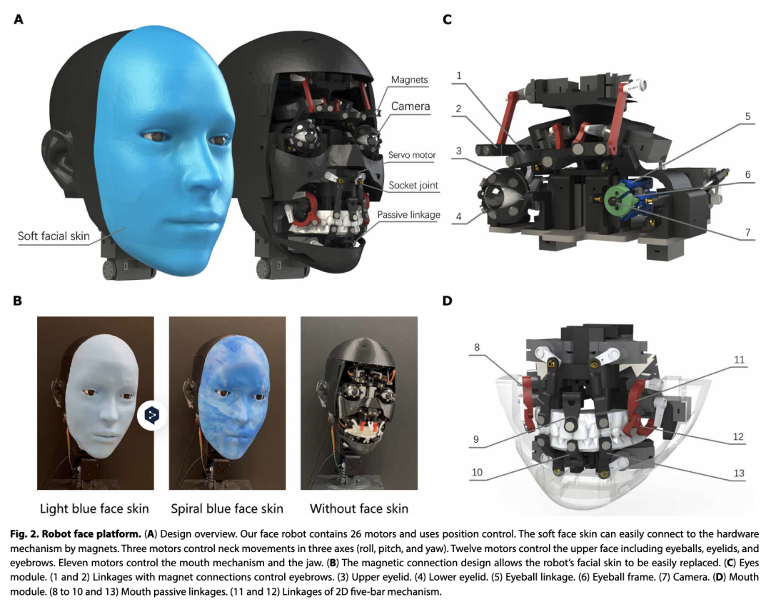 為(wei) 此,Yuhang Hu 及其同事需要解決(jue) 兩(liang) 大難題:一是如何以機械方式設計一個(ge) 表情豐(feng) 富的機器人麵部,這涉及複雜的硬件和執行機製;二是知道該生成哪種表情,以使它們(men) 看起來自然、及時和真實。