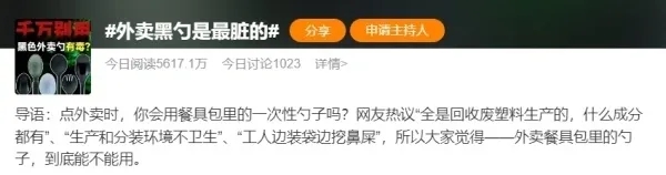 網上有新聞說#黑色塑料餐具是最髒的#引發網友熱議,有人聲稱:“黑色一次性餐勺是回收廢塑料生產(chan) 的,什麽(me) 成分都有”“塑料透明度越高才越安全”……