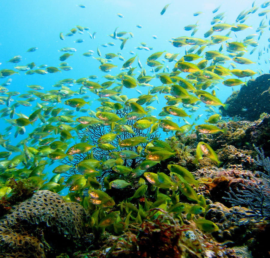台灣東(dong) 北角龍洞灣的一群褐藍子魚的幼魚,成群的在啃食淺海區礁石上的藻類。 褐藍子魚在幼魚時體(ti) 色為(wei) 黃綠色。(圖片來源:Wikipedia)
