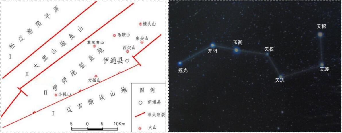 吉林省伊通火山群“七星山”大致展布位置圖(左圖)和北鬥七星空間展布圖(右圖)(兩(liang) 圖均源於(yu) 網絡)