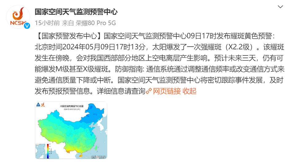預警截圖來源:國家空間天氣監測預警中心官方微博