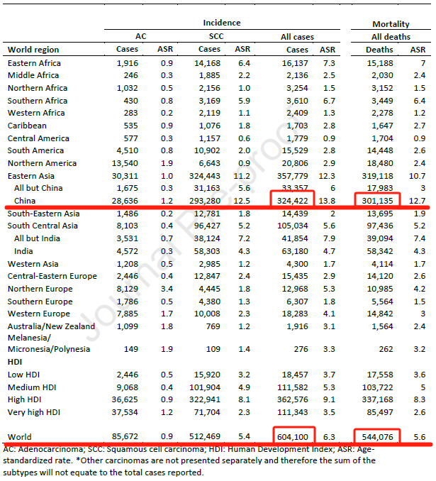 也就是說,全球近一半的食管癌發病和死亡病例都在中國。