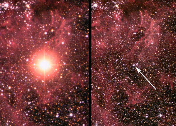 大麥哲倫(lun) 星雲(yun) 中的恒星在1987年2月23日爆炸前(右)和爆炸後(左)。圖:DavidMalin Anglo Australian Telescope