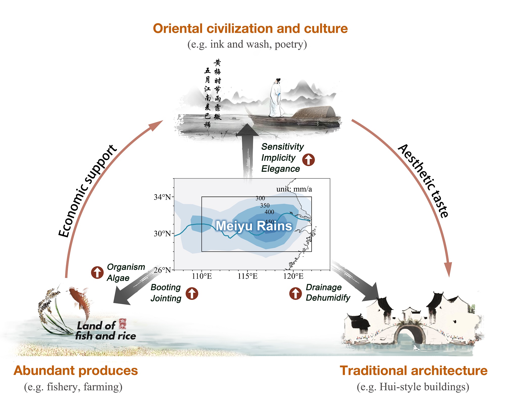 圖1 傳(chuan) 統梅雨塑造江南經濟和文化的概念模型