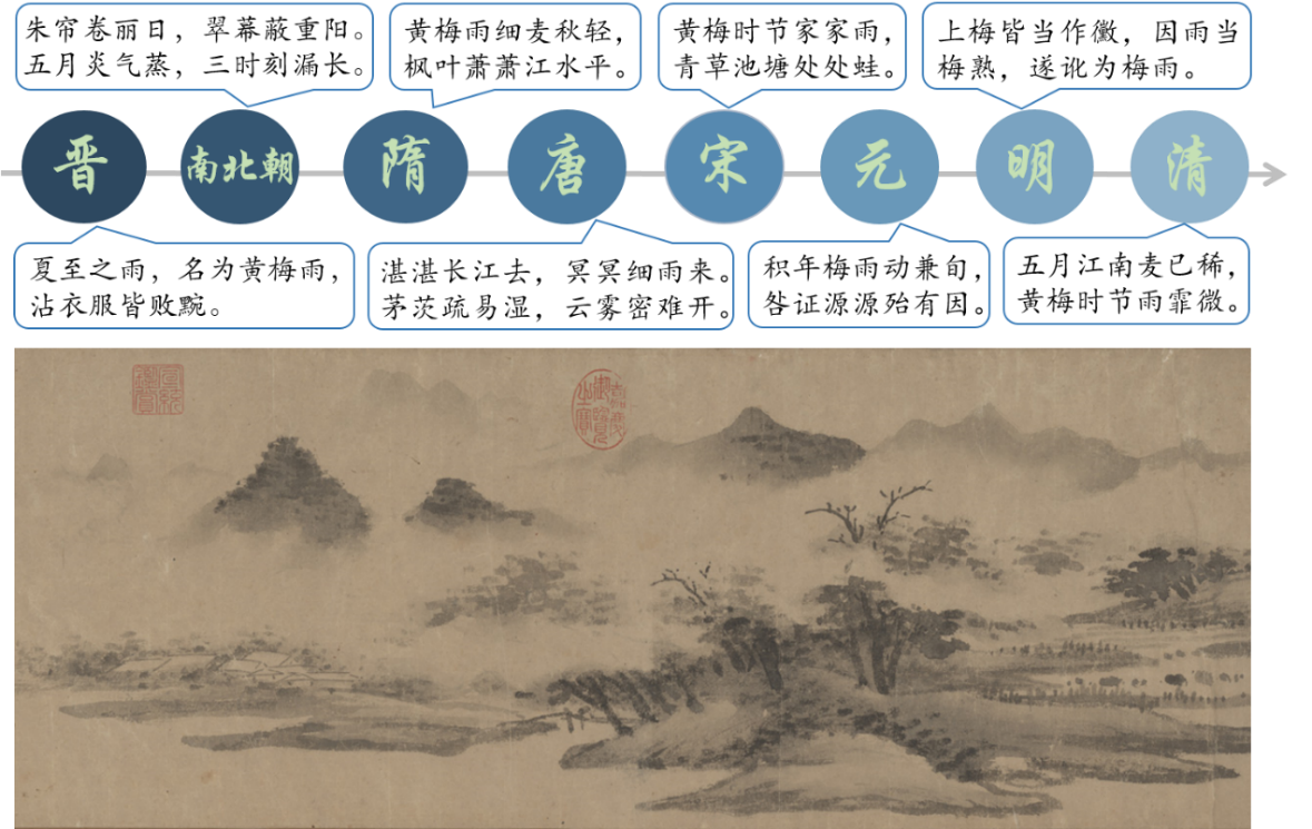 圖2 中國古代以梅雨為(wei) 文化意象或主題的詩詞(上)以及明代畫家沈周繪製於(yu) 蘇州太湖的《西山雨觀圖》(下)