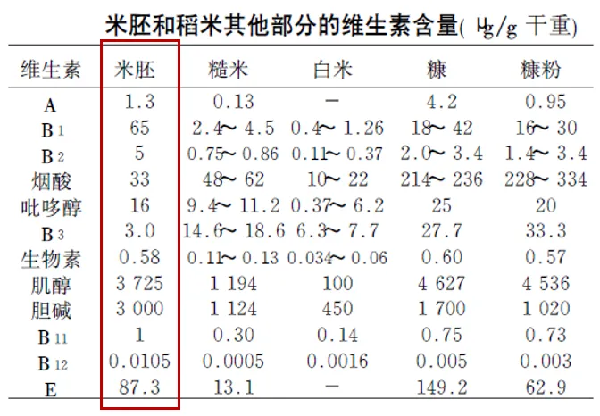 米胚和其他部分的維生素含量(μg/g幹重)|[1]