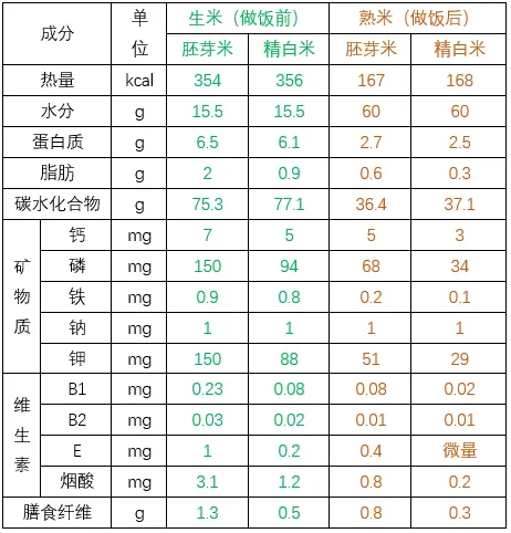 保留了胚芽的胚芽米營養(yang) 成分也要高於(yu) 精白米。煮熟後的胚芽米飯,鈣、鐵、鉀等元素含量是精白米飯的兩(liang) 倍左右,維生素B1、煙酸和膳食纖維含量是其3-4倍,是更營養(yang) 的主食之選。尤其是平時飲食結構比較單一、新鮮蔬菜水果吃得少的人群,都可以用胚芽米代替部分精白米。