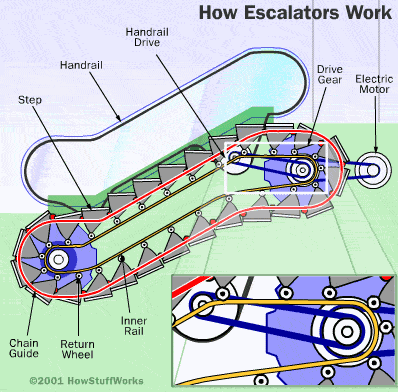 從(cong) 自動扶梯的設計原理看,自動扶梯的坡度,比日常的建築機製結構的樓梯高度要高一點,並不適合行走。