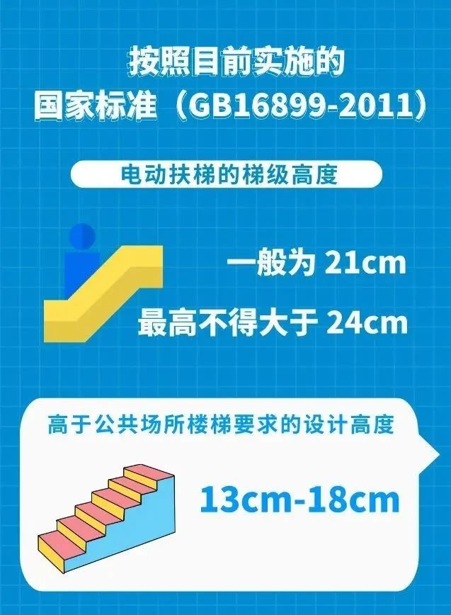 自動扶梯的梯級高度與(yu) 樓梯的台階高度不同,按照目前實施的國家標準《自動扶梯和自動人行道安裝安全規範》(GB16899-2011),自動扶梯的梯級高度最高不得大於(yu) 24cm,一般自動扶梯的梯級設計高度均高於(yu) 公共場所樓梯要求的設計高度13cm-18cm。