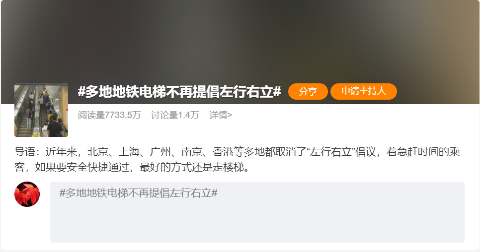 基於(yu) 此,最近有網友建議成都地鐵提醒、引導乘客乘坐自動扶梯時“左行右立”,但成都地鐵回應:這種做法不提倡!相關(guan) 話題立即登上熱搜,引發各方關(guan) 注。