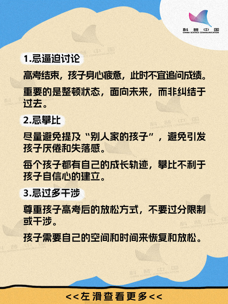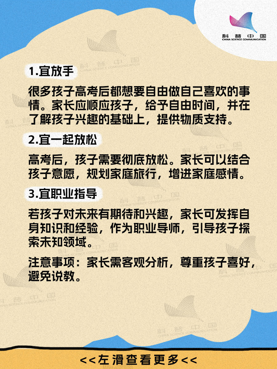 緊鑼密鼓的高考終於(yu) 結束了,孩子進入了休整狀態,但家長的考卷可還沒結束:請問孩子高考完都有哪些常見的表現?作為(wei) 家長,這段時間“宜”做什麽(me) ?“忌”做什麽(me) ?