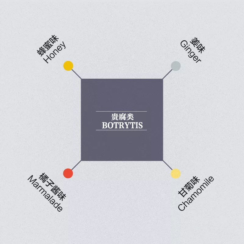 貴腐菌(Botrytis/Noble Rot)是一種專(zhuan) 門侵蝕成熟果實或菜蔬的真菌。盡管它的存在不再能保證風味的新鮮度,但它卻能增加風味的濃鬱度以及複雜度。在各類葡萄酒中,蘇玳貴腐甜白(Sauternes)以及托卡伊甜白(Tokaji)往往伴有橘子醬味;而遲摘雷司令(Spatlese Riesling)則往往帶有薑味。泥土味類