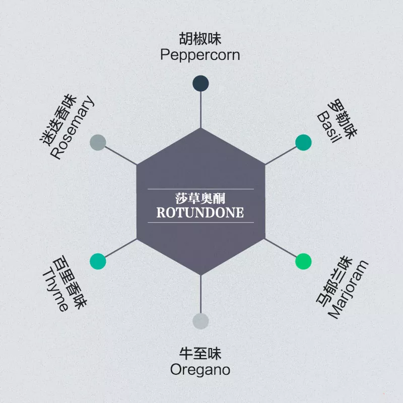 莎草奧酮也是一種萜類化合物,常見於(yu) 各種精油中,如黑胡椒、迷迭香、百裏香和羅勒等。很多優(you) 質紅葡萄酒都可能帶有典型的胡椒味。比如,西拉、赤霞珠和綠維特利納(Gruner Veltliner)等都可能帶有胡椒的風味;雷司令幹白葡萄酒則往往伴有羅勒香氣;而維歐尼(Viognier)和瓊瑤漿則可能伴有紅胡椒味。